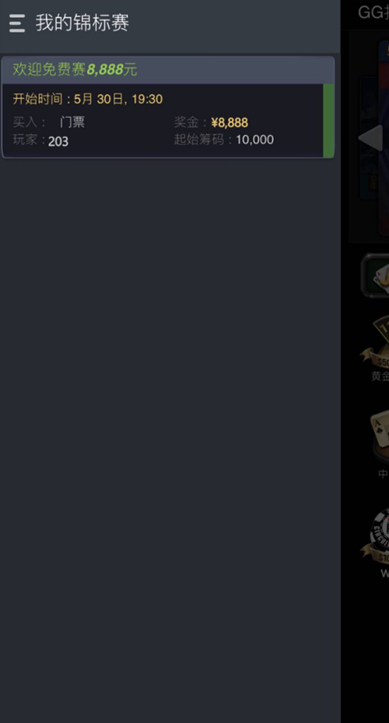 在游戏总览处,点选我的锦标赛,即可查看到所报名以及可以参加的锦标赛赛事。