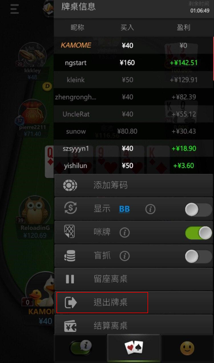 在中国桌的德扑中,玩家必须点选结算离桌,排桌上的余额才会返回至扑克余额中。