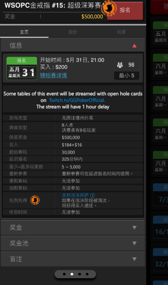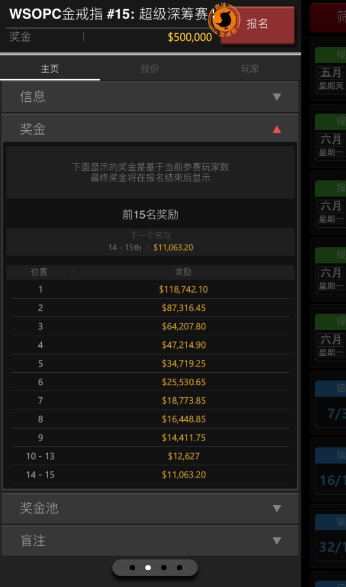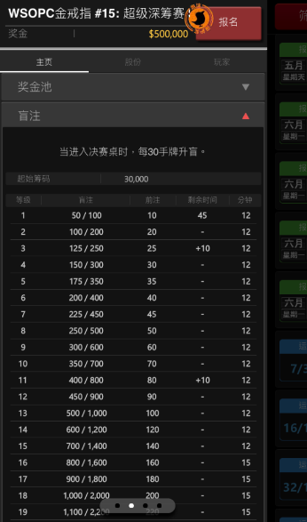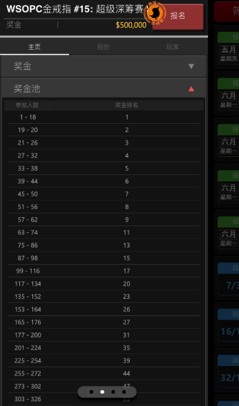 您可以透过锦标赛大厅,查看锦标赛的相关资讯,包含赛事结构,奖金结构,钱圈范围,涨盲资讯。