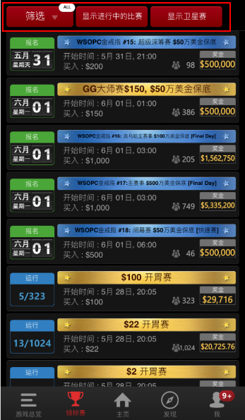 您可以透过锦标赛页面上方的筛选工具,来快速的找到您想参加的比赛